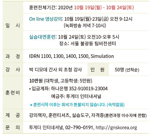 계획된 재난구조훈련 과정(IDRN : International Disaster Response Network)을 수료한 훈련생들에게 IDRN 회원증이 수여되며, 이 자격증을 소지한 분들은 세계 도처에서 일어나는 재난현장에 출입할 수 있을 뿐만 아니라 북한의 문이 열리면 국제자원봉사자의 자격으로 보다 전문적인 재난구조에 참여할 수 있습니다.